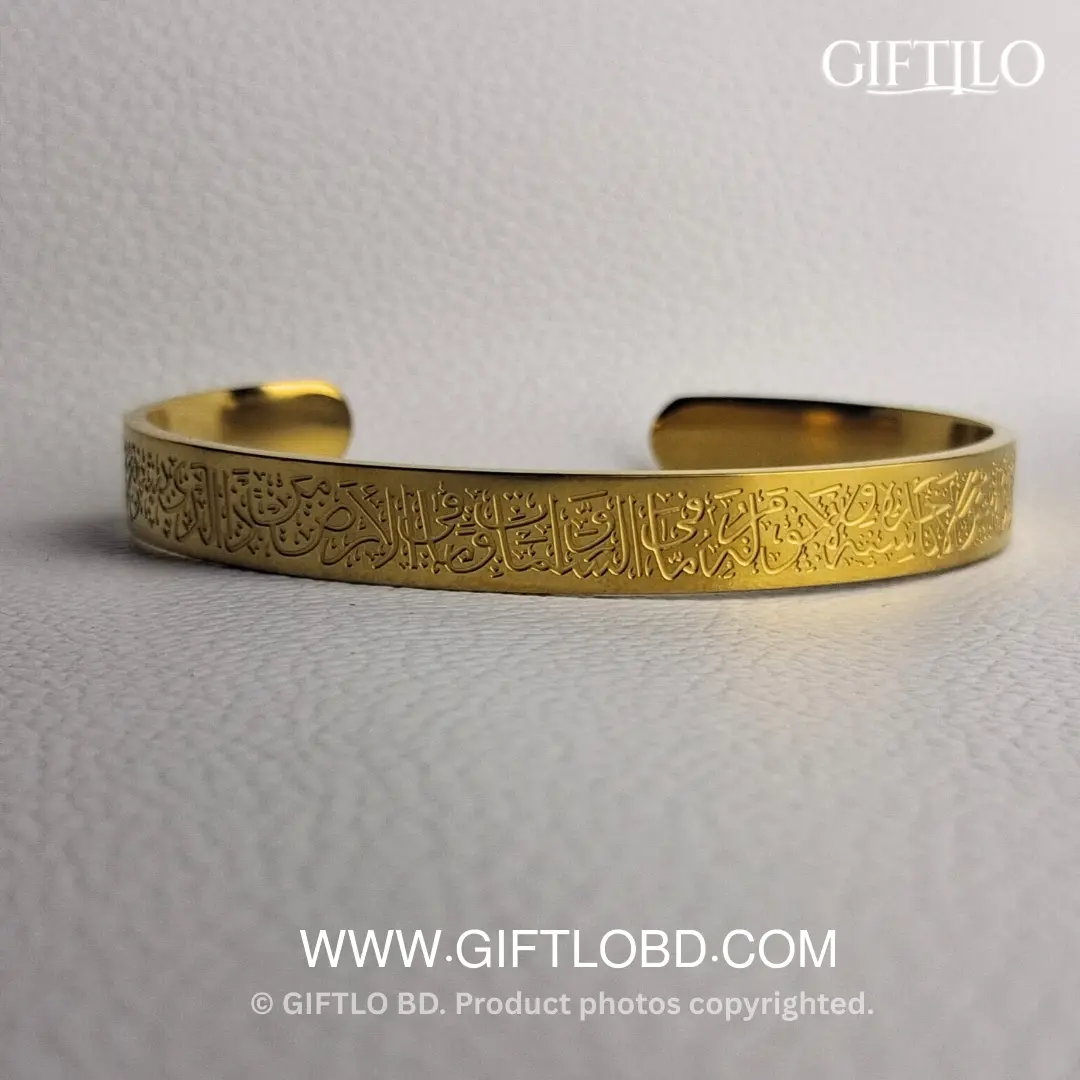 প্রিমিয়াম Stainless Steel দিয়ে তৈরি এই এলিগেন্ট গোল্ড ব্রেসলেটে খোদাই করা আছে পবিত্র Ayat Al-Kursi (The Throne Verse), যা আপনাকে দেবে আধ্যাত্মিক প্রশান্তি ও একটি পরিশীলিত ইসলামিক লুক।