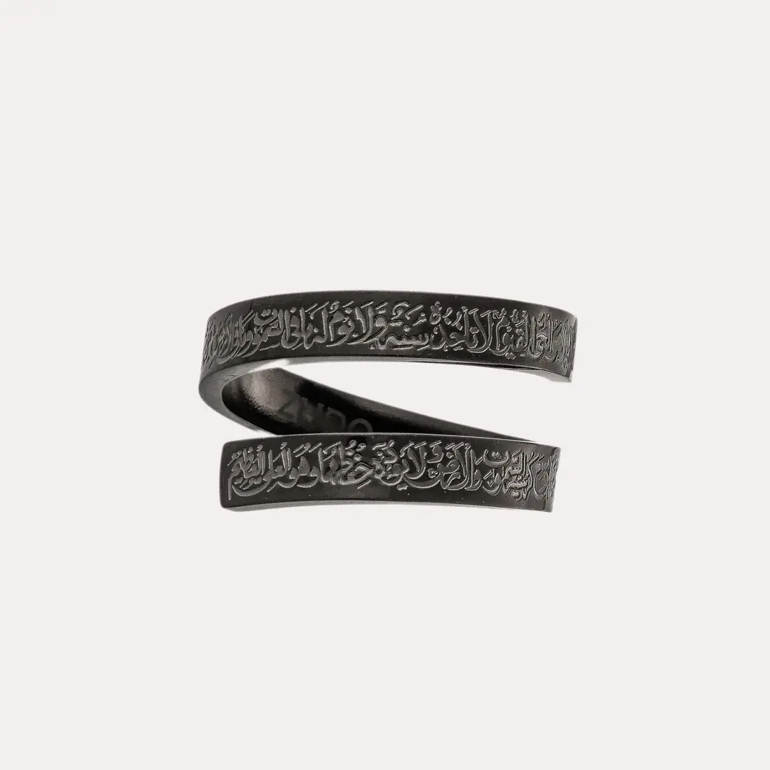 প্রিমিয়াম Stainless Steel দিয়ে তৈরি এই ব্ল্যাক এডিশন রিং–এ খোদাই করা আছে পবিত্র Ayat Al-Kursi (The Throne Verse), যা আপনাকে দেবে আধ্যাত্মিক প্রশান্তি ও একটি শক্তিশালী ইসলামিক লুক।
